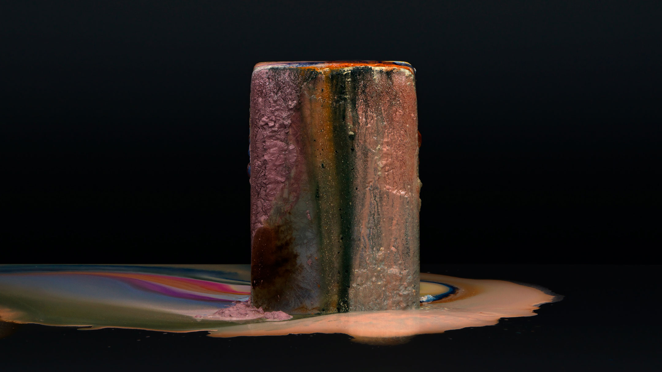 Dawn Ng’s work across a wide range of contemporary media is unified by subtle gradations of colour, which function as a way of exploring the passage and experience of time. Since 2018, Ng has filmed and photographed stages in the disintegration of frozen blocks of coloured pigment. The Earth is an Hourglass, 2024 documents the time-adjusted melting of one such block of ice with the hypnotic effect. Her video compresses the entire 20-hour process of decomposition into a mesmerising 20 minutes.
