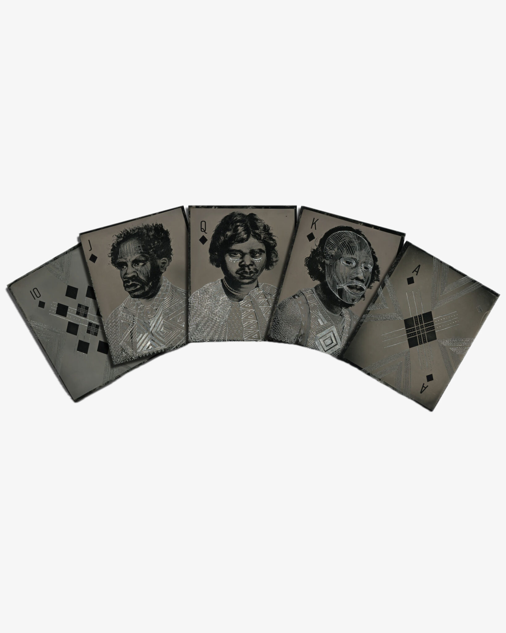 Over the past year, Shen has mastered these card tricks stemming from his long-held fascination with stage magic and hard-won skills in sleight of hand. My Cuzzy Nate and the 654 Club adapts magician Bill Malone’s narrative-based, multi-part card trick ‘Sam the Bellhop’ into a warm and personal story. Shen will use his custom-designed set of playing cards, which features historic images of Aboriginal men and women, adorned with Shen’s Ngarrindjerri motifs. Each card extends the imagery of Shen’s tintype series into an object of play, exchange, and collection.
