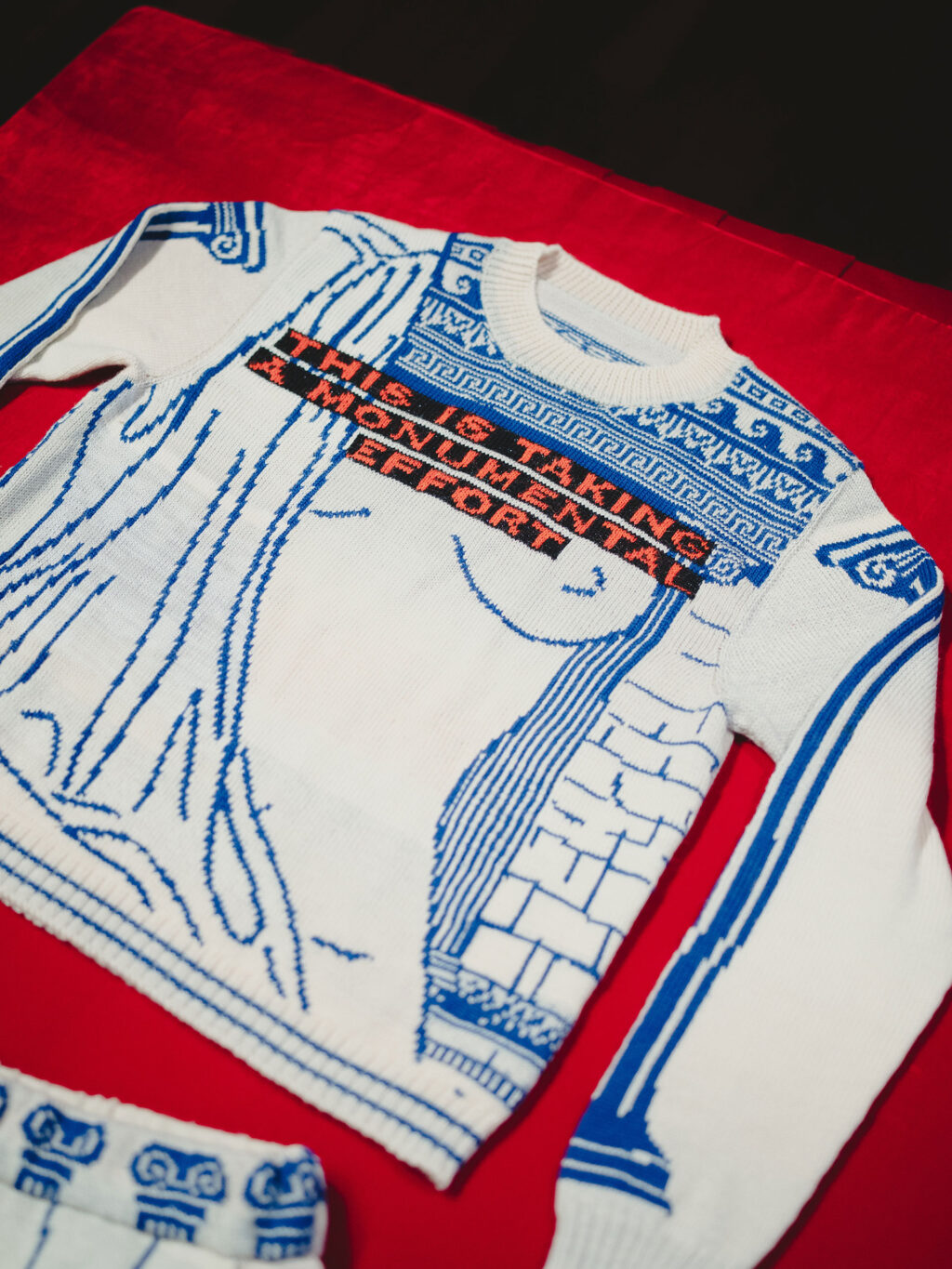 I wanted to create a sort of uniform to articulate that effort, and for this work, it takes the form of a knitted tracksuit, laid flat and lying in state. It draws from the language of statues, plinths, and memorials, but translates those forms into something soft, domestic, and wearable. A garment associated with comfort and leisure becomes an artefact of quiet resistance.