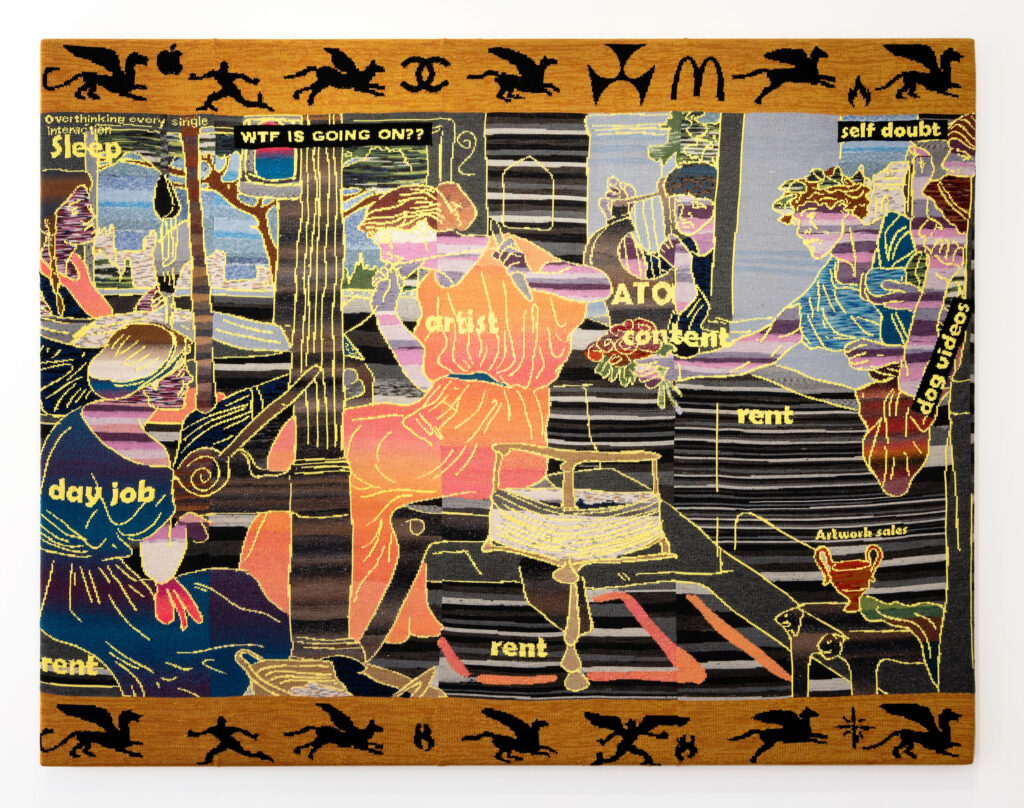 Hahahaha. I’ve been thinking about this work as a disgusting cocktail or unwanted canape that blends 1990’s Microsoft Encarta (thinking the included PC game), a dreaded relative’s tour of Europe through photos on their iPad and the notes section of my phone where all my most mundane and maniacal thoughts are archived. The work takes the form of a knitted tapestry that composites together several images drawn from historical sources, the imagination and art history. At the moment I’ve been thinking about ideas around the spectacle, and also about how the working life of our current society was imagined or envisaged by previous societies and how we may have fallen short of many of those early pseudo utopian ideals. While we may not yet have our flying cars, our jobs are getting taken by the robots. What might it mean to create art, to witness it, in an age where images can be prompted into being. It’s all another big soup really.