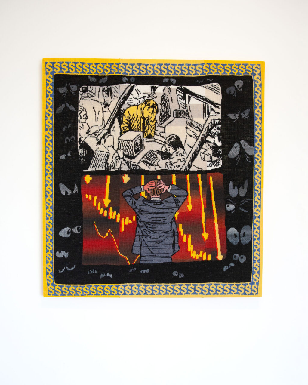 I will generally spend a lot of time thinking about a topic or idea and then lots of visual research takes place, going back through archives, phone notes, scrap bits of text I’ve recorded and then produce a digital image, or a cartoon that forms the basis for the work. That image is then charted into a graph, sometimes 10000 stitches by 1000 rows of work and divided up into lengths that are knitted on the machine. Everything is knitted in reverse as you’re always working from the back of a piece and then finally all the individual threads are woven in, the panels are stitched together, and the piece is wet blocked. I kind of enjoy the joke in spending months of time meticulously translating the immediacy of a rough digital sketch into something that resembles tapestry. Often the first time I will see how a work has turned out is the same moment the audience will as they are too big to stretch or show upright in my own studio. So it’s pretty nervy, and I can get quite anxious about how they will turn out.