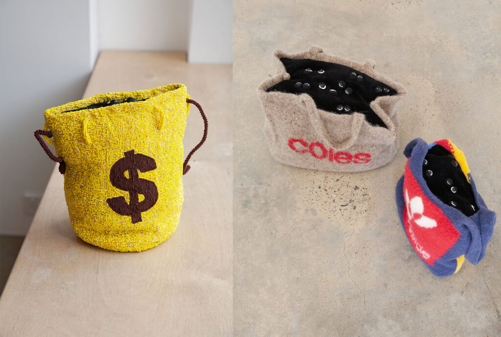 Chook bag, Coles bag, money bags. These elements of everyday capitalism inject a sense of humour in your work while simultaneously subverting capitalism through their making. Can you expand on how capital essentially becomes a character in your work, especially in your recent exhibition with Sydenham International?