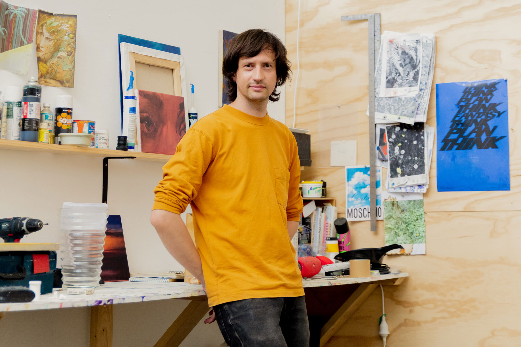 Melbourne Art Fair seized the opportunity to visit Dane Lovett in his studio and gain insight into his practice. He spoke about his use of a restrictive colour palette, creating illusions by warping imagery, and coming from a long line of artists.
