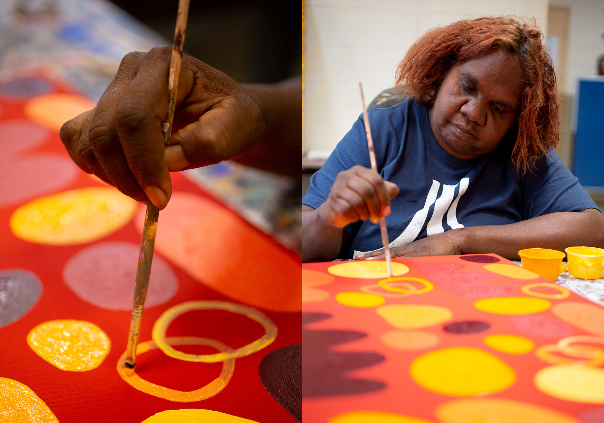 Through her vibrant, flowing brushstrokes, Keturah continues the artistic legacy of her mother and grandmother, carrying forward their stories of Karrkurutjintja (Lake McDonald), while reinterpreting them in her own bold contemporary style.
